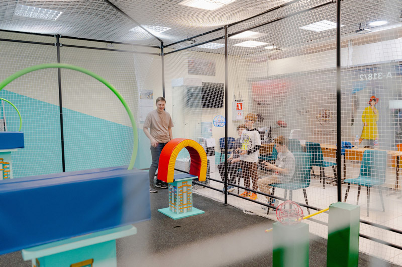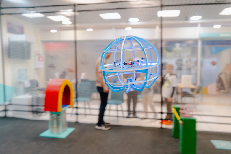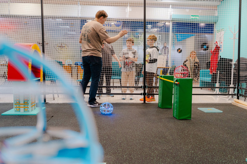 Используйте всё содержимое арены и летайте на своих дронах с собственными батареями. Дадим возможность подзарядить их. Рядом наш инструктор для решения технических вопросов.